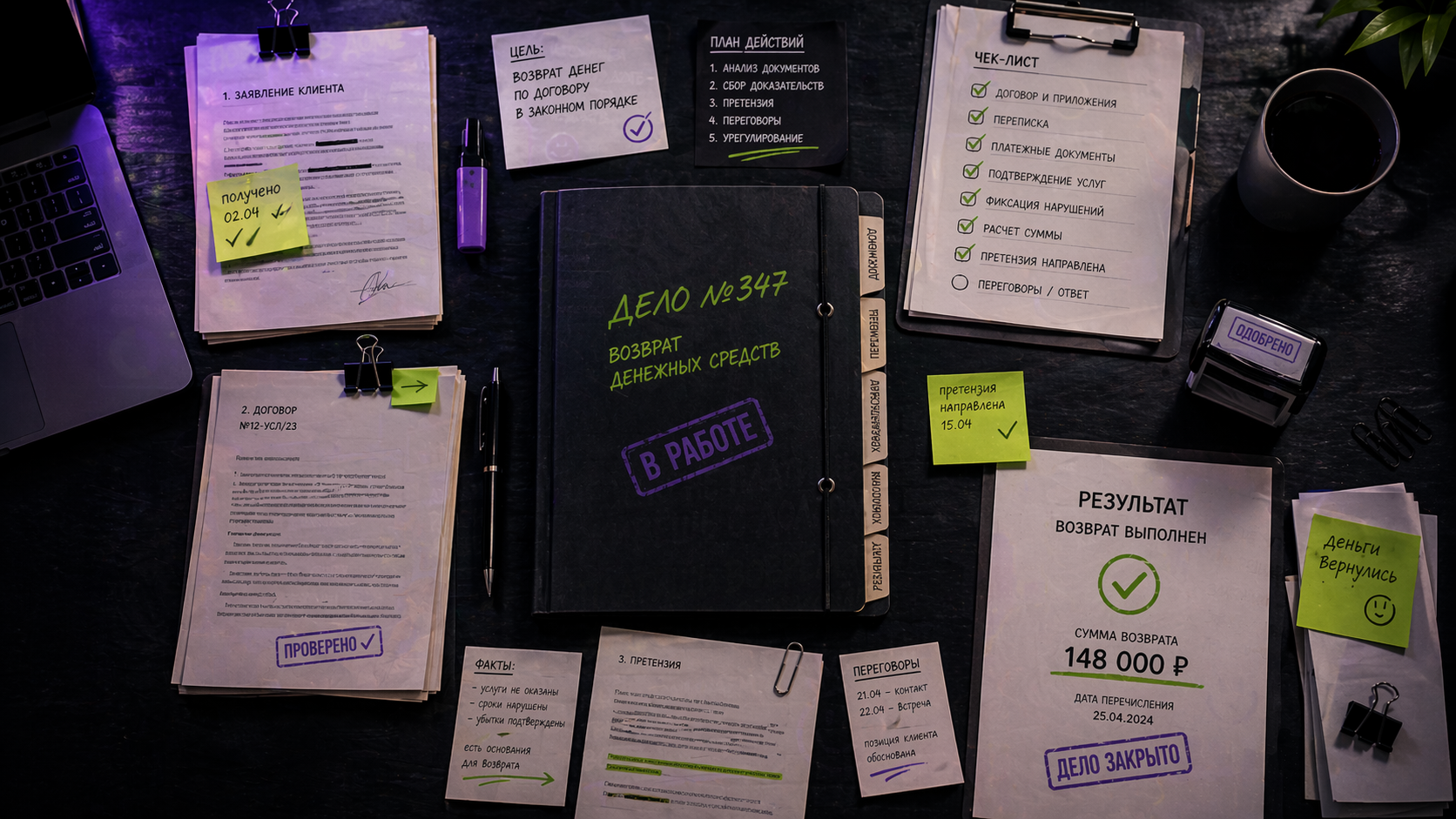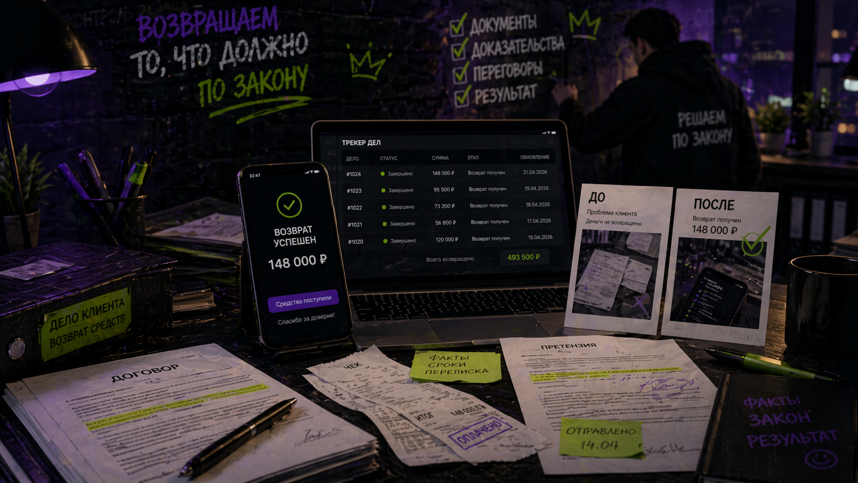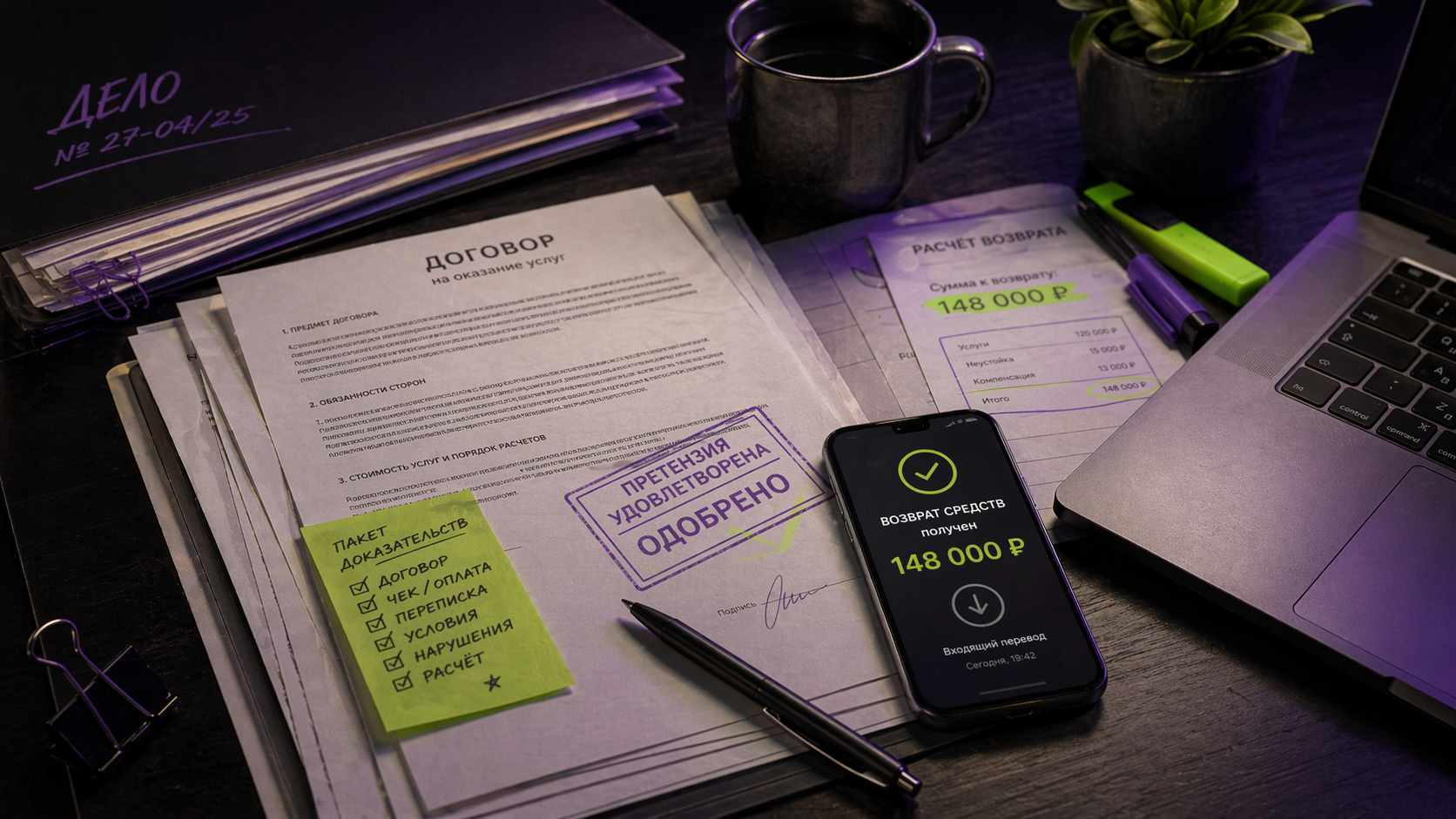 Возвращаем деньги, которые должны были вернуться ещё вчера. Без кулаков, без угроз, без «вы чё». Только договор, претензия, суд и нужная сумма на ваш счёт.
