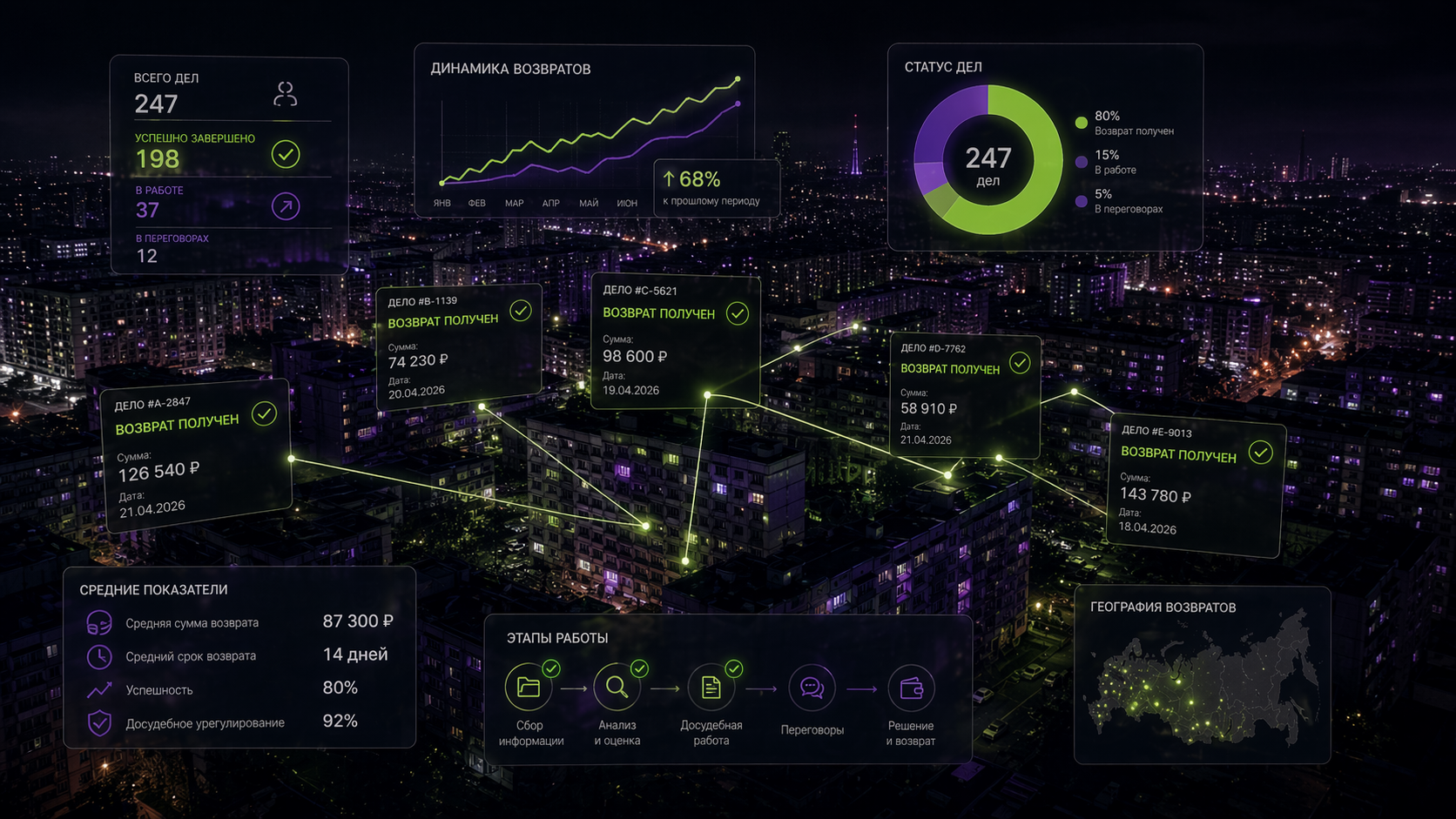У каждого клиента — личный трекер дела: этап, документы, сумма, дата. Никаких «перезвоним через неделю».